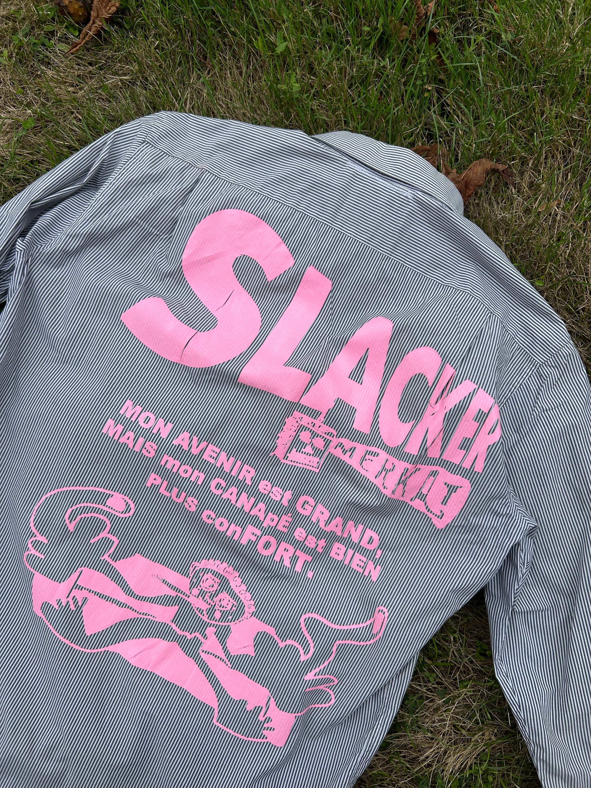 Une vraie chemise Slacker, récupérée, réinventée, sérigraphiée.