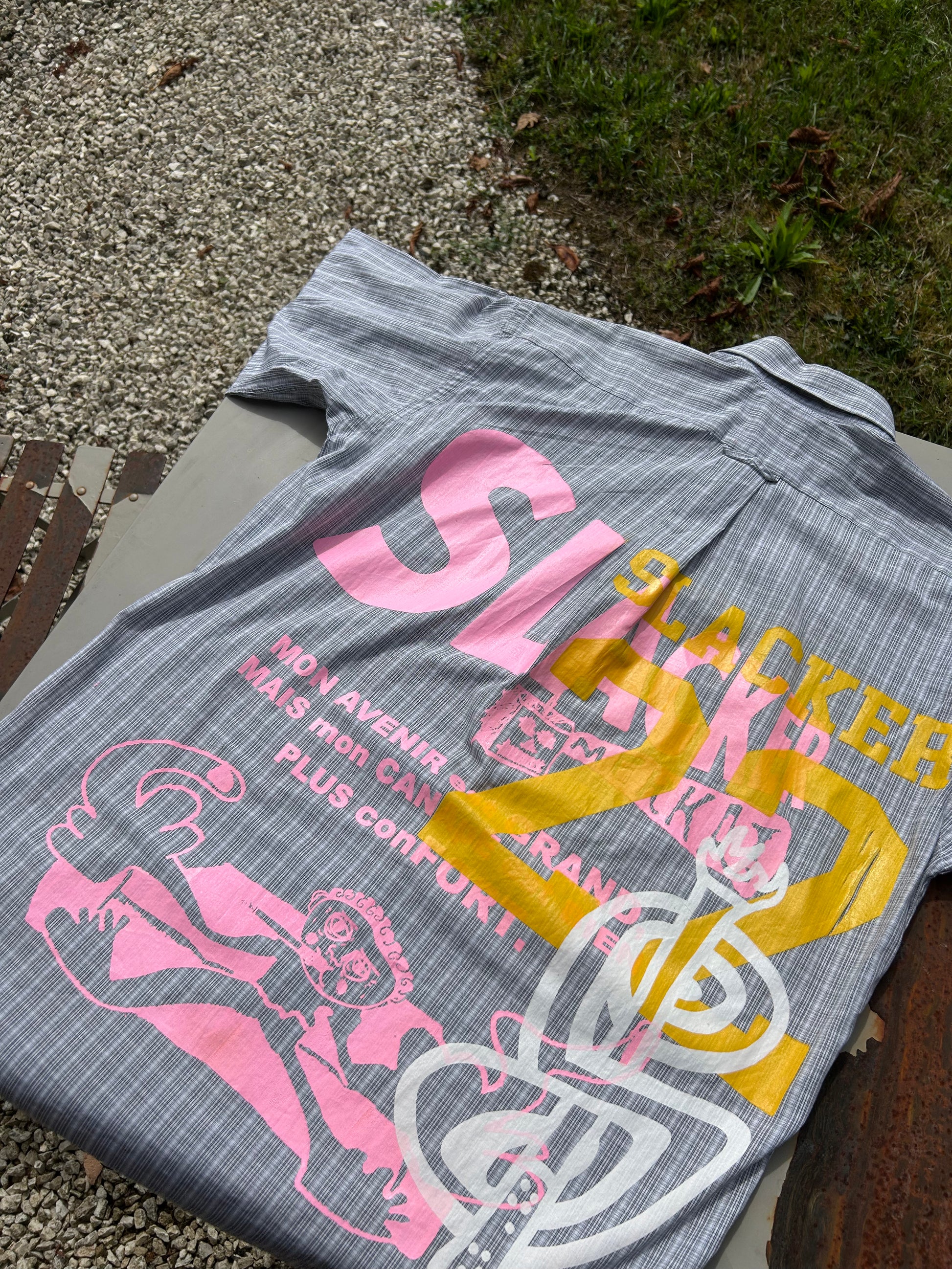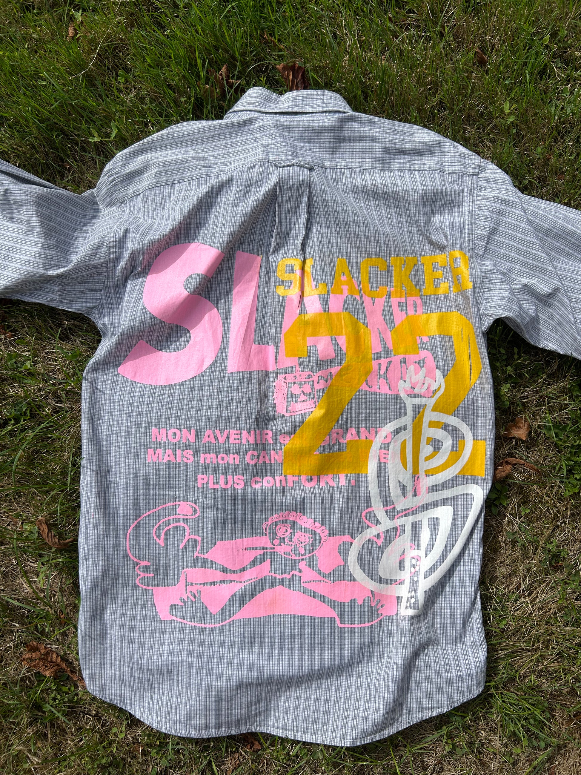 Une vraie chemise Slacker, récupérée, réinventée, sérigraphiée.