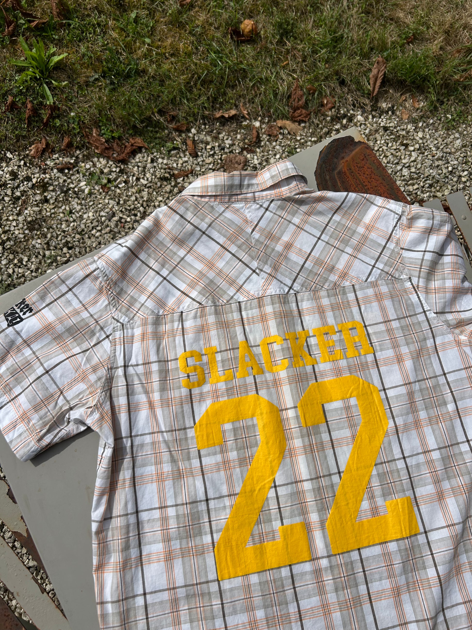 Une vraie chemise Slacker, récupérée, réinventée, sérigraphiée.