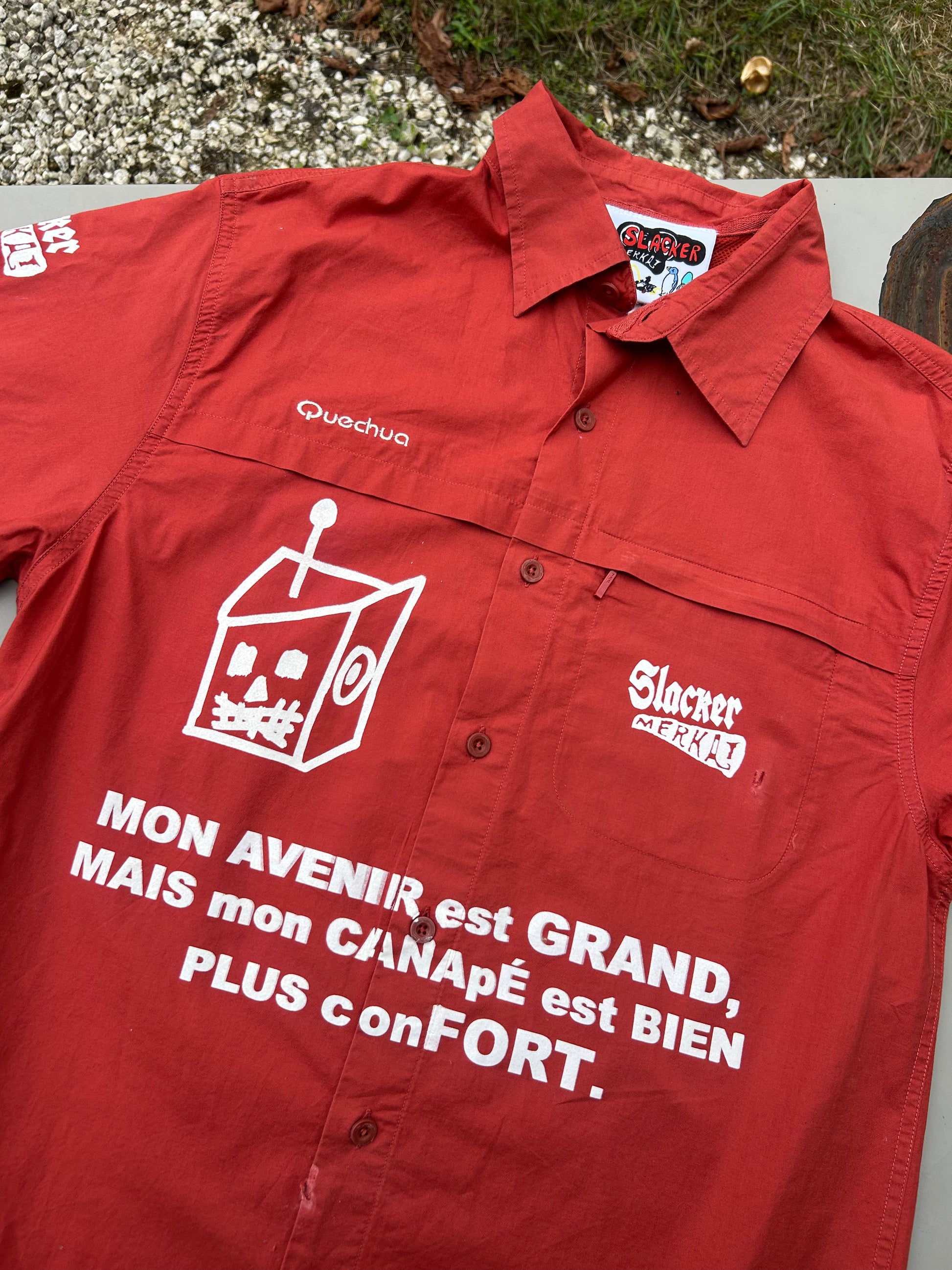 Une vraie chemise Slacker, récupérée, réinventée, sérigraphiée.