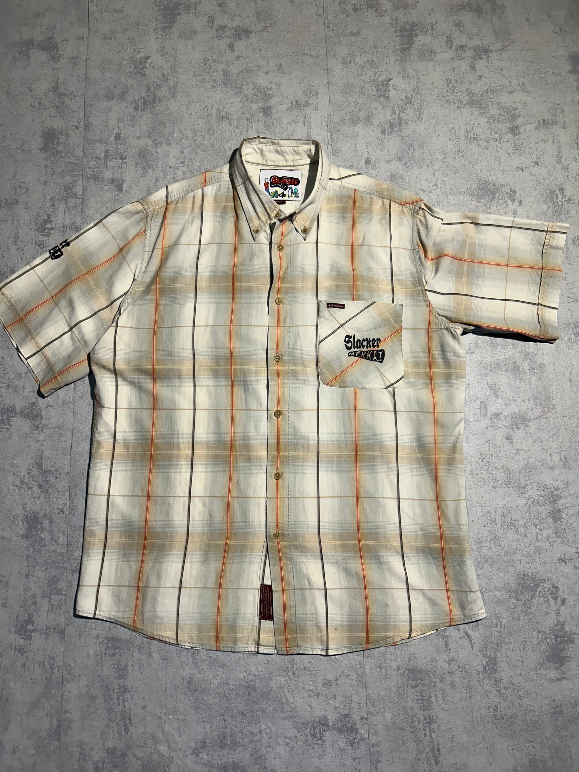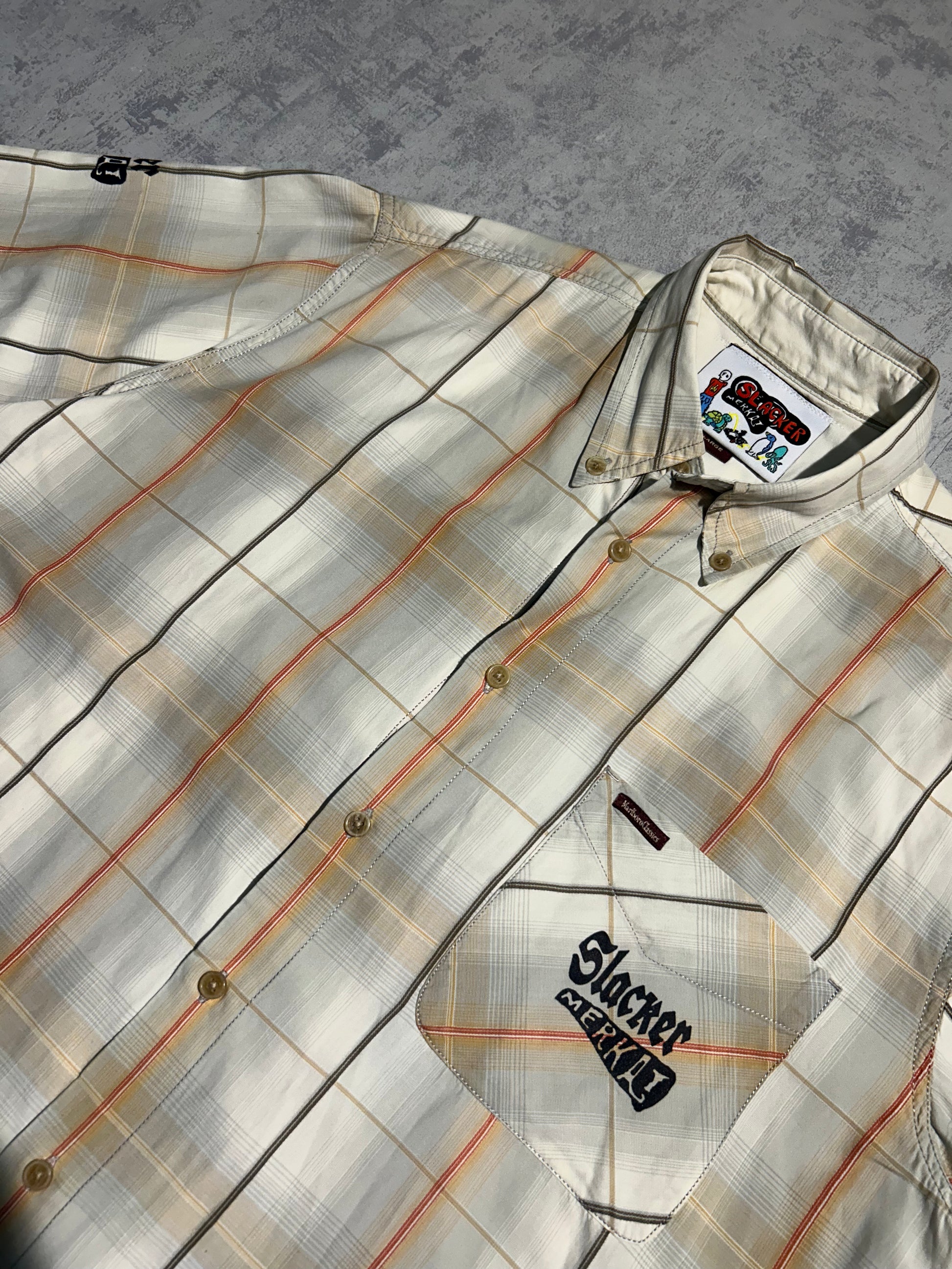 Une vraie chemise Slacker, récupérée, réinventée, sérigraphiée.